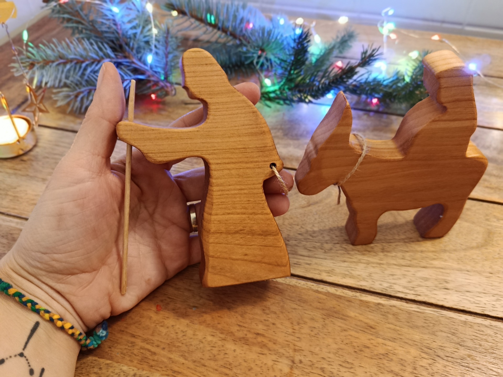 Várandós Mária szamárháton, József botjával és a gyeplővel vezeti őket Betlehembe.Magasságuk kb 13,7 cmMindegyik kézzel készül, a figurák mintázatat garantáltan más és más :)Felületük viaszozott (EN71-3 szabvánnyal rendelkező fa felületkezelő)